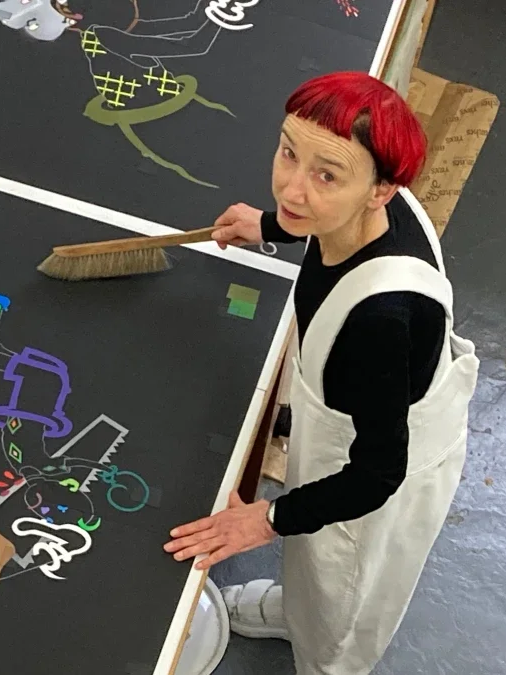 Oona Grimes is a London based artist renowned for her work in drawing, clay and film. She merges flattist collage, print and painting with sculptural objects and filmed performances, crafting a unique and personal universe. Grimes’s work reflects a deep obsession with language, exploring its beginnings and ends, and the nuances of learning and losing it. Her characters often represent the unseen and the unlovely, wrapped in fuzzy felt drawings that blend Commedia dell’arte slapstick with comic strip aesthetics. During her 2018 Bridget Riley fellowship at the British School at Rome, Grimes researched Etruscan tomb paintings and the Neorealist cinema, creating mis-remembered re-enactments that physically integrate her into the film frame. Grimes graduated from Norwich School of Art [1986] and the Slade School of Fine art [1988]. She was awarded the Bryan Robertson Award in 2022 and elected to the Royal Academy in 2023. Recently a visiting lecturer at the Royal College of Art and Ruskin School of Art, Oxford University.